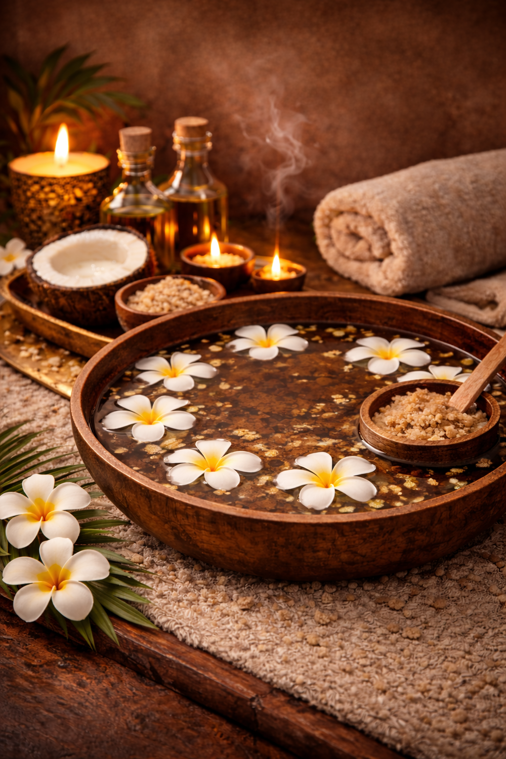 Zu Beginn erwartet Sie ein traditionelles Fußbad mit Peeling, das die Füße reinigt und den Körper sanft auf die Massage vorbereitet. Die Behandlung wird mit traditionellem Kokosöl durchgeführt, das die Haut pflegt und geschmeidig macht.
